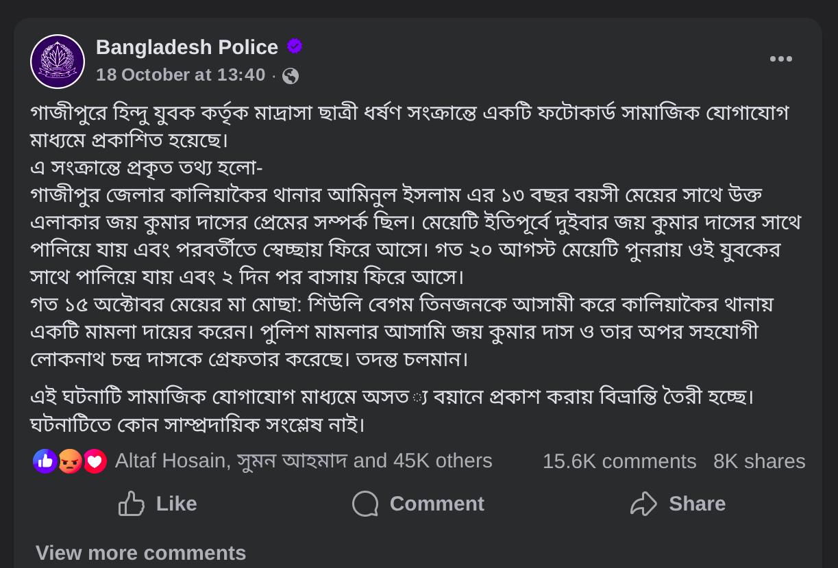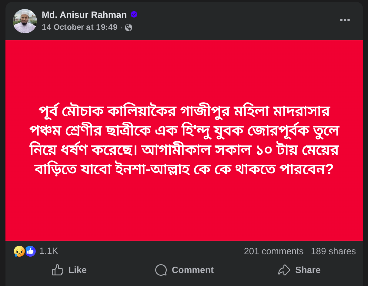 "গাজীপুরে হিন্দু যুবক কর্তৃক মাদ্রাসা ছাত্রী ধর্ষণ সংক্রান্তে একটি ফটোকার্ড সামাজিক যোগাযোগ মাধ্যমে প্রকাশিত হয়েছে।